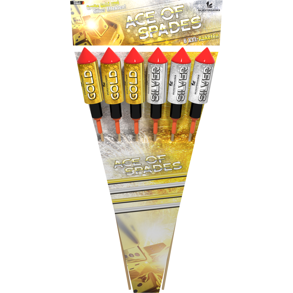 n6 maximaal gevulde raketten met luide knal. 3 stuks in zilver en 3 stuks in goud. Topkwaliteit!
