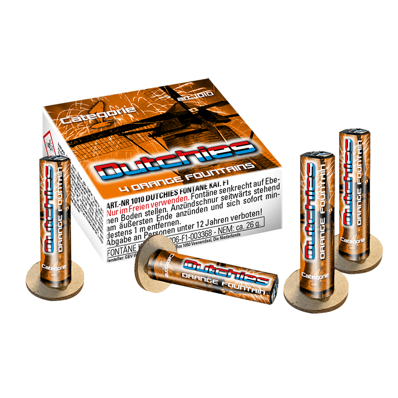 De Oranjefans van Nederland poppen overal ter wereld in het oranje op. Bij voetbal, formule1, overal zie je ze verschijnen. Zo ook dit nieuwe oranje effect van de Dutchies! Een set van vier Categorie1 fonteinen met uniek nieuw oranje effect. Dutchies Goedkoop vuurwerk kopen bij Vuurwerkwinkel Ede