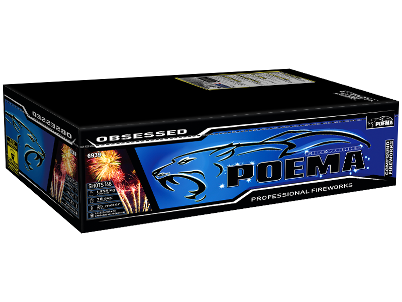 Obsessed nDe Obsessed is een mooie V-shape compound cake uit de nieuwe Poema serie met 168 shots! n nKruitgewicht 1658 Gram nTube diameter 25 / 30 nBrandtijd 78 Seconden nHoogte 30 m. – 35 m. Obsessed Goedkoop vuurwerk kopen bij Vuurwerkwinkel Ede