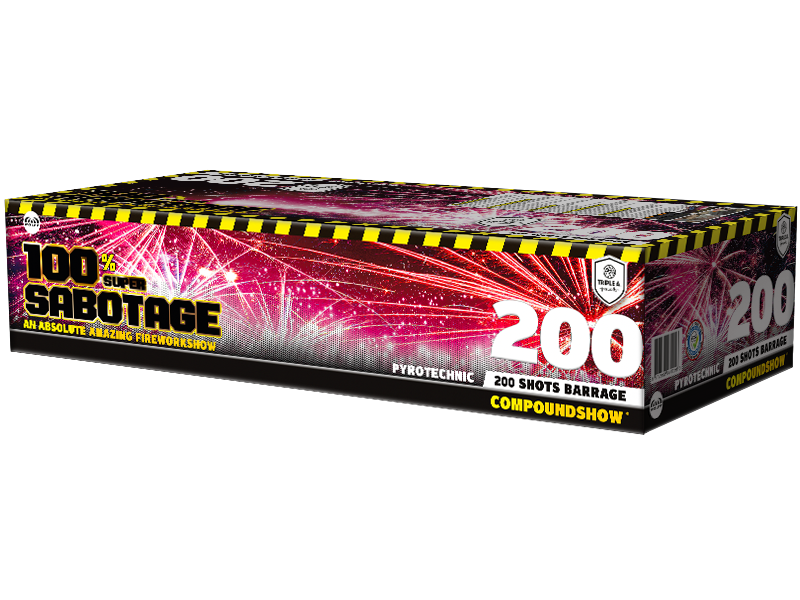 Sabotage nHet kenmerkende aan deze compound is dat hij op zeer mooie manier blinkers, kometen, peonies en meer combineerd in een totaal nieuwe ervaring van vuurwerk! n nKruitgewicht 1957 Gram nTube diameter 20 nBrandtijd 95 Seconden nHoogte 20 m. – 25 m. Sabotage Goedkoop vuurwerk kopen bij Vuurwerkwinkel Ede